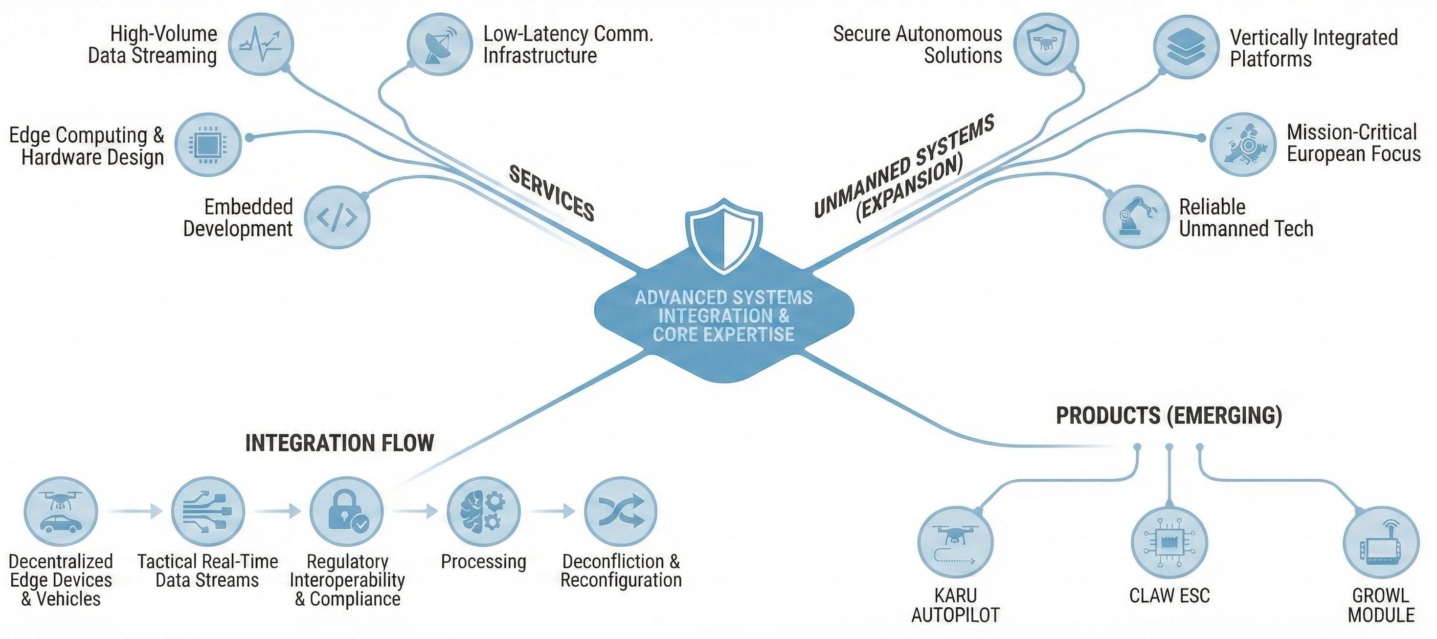 Known for implementing large-scale, mission-critical systems in Commerce and Automotive, we are expanding into Unmanned Vehicle Technologies. We develop secure, compliant, vertically integrated autonomous solutions for Europe while maintaining our commitment to reliability and innovation.